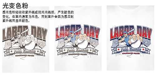 光變粉:外觀為白色粉未狀,粒徑大約:1~10μm,在太陽光或紫外線照射下,從無色變成有色,本身具有可逆性。顏色分為:紅、黃、蘭、紫。適用于布匹、服裝、塑膠、玩具、鞋材、印刷等工藝。